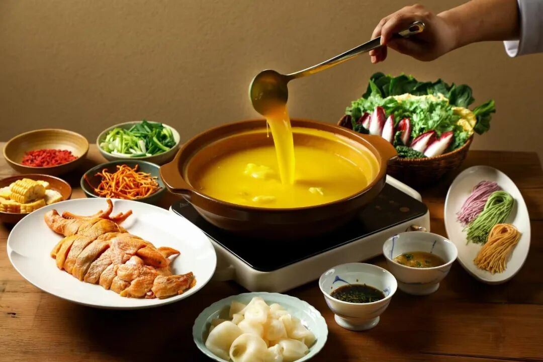 정통 광둥식 닭고기 솥찜(广式鸡煲)은 겨울에 가장 든든한 위안이다. 고전적인 광둥식 돼지내장 닭고기탕 외에도 삼우회(三友荟) 식당에는 여러 종류의 베이스 탕국물을 준비하여 신선한 맛을 즐길 수 있도록 했다. 오지모도 냄비탕, 무화과 냄비탕, 그리고 청올리브 냄비탕 등 각각의 메뉴는 독특한 풍미를 가지고 있다.